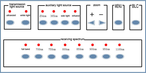 當(dāng)要顯示票證上熒光暗記、圖案時(shí),按動(dòng)激發(fā)多波段光源按鈕,選擇合適波段的光源,這樣可獲得紫外熒光效果。